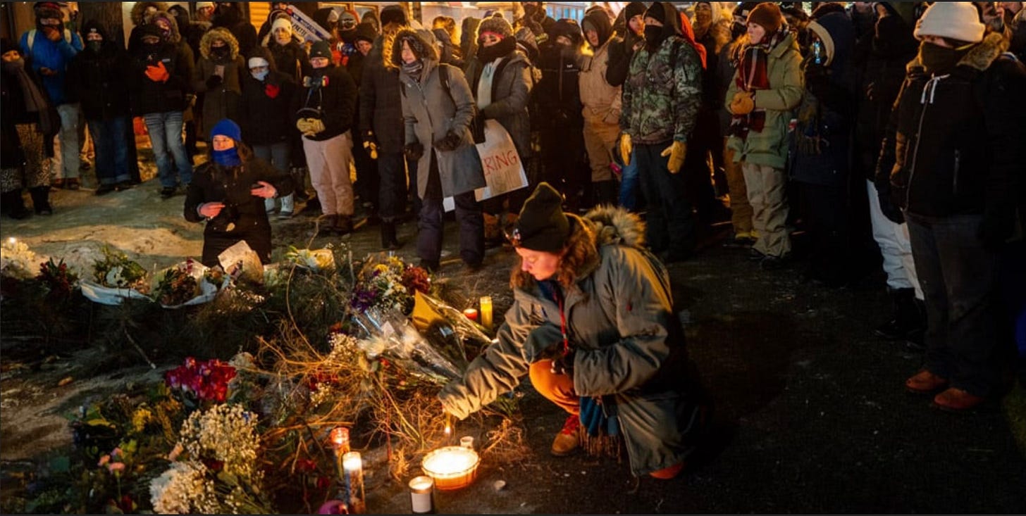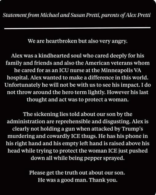 Then at home this weekend, Alex Pretti was executed in the streets of Minneapolis after trying to defend a woman from being attacked with pepper spray while protesting. People watched it happen. The video exists. Everyone has seen it.