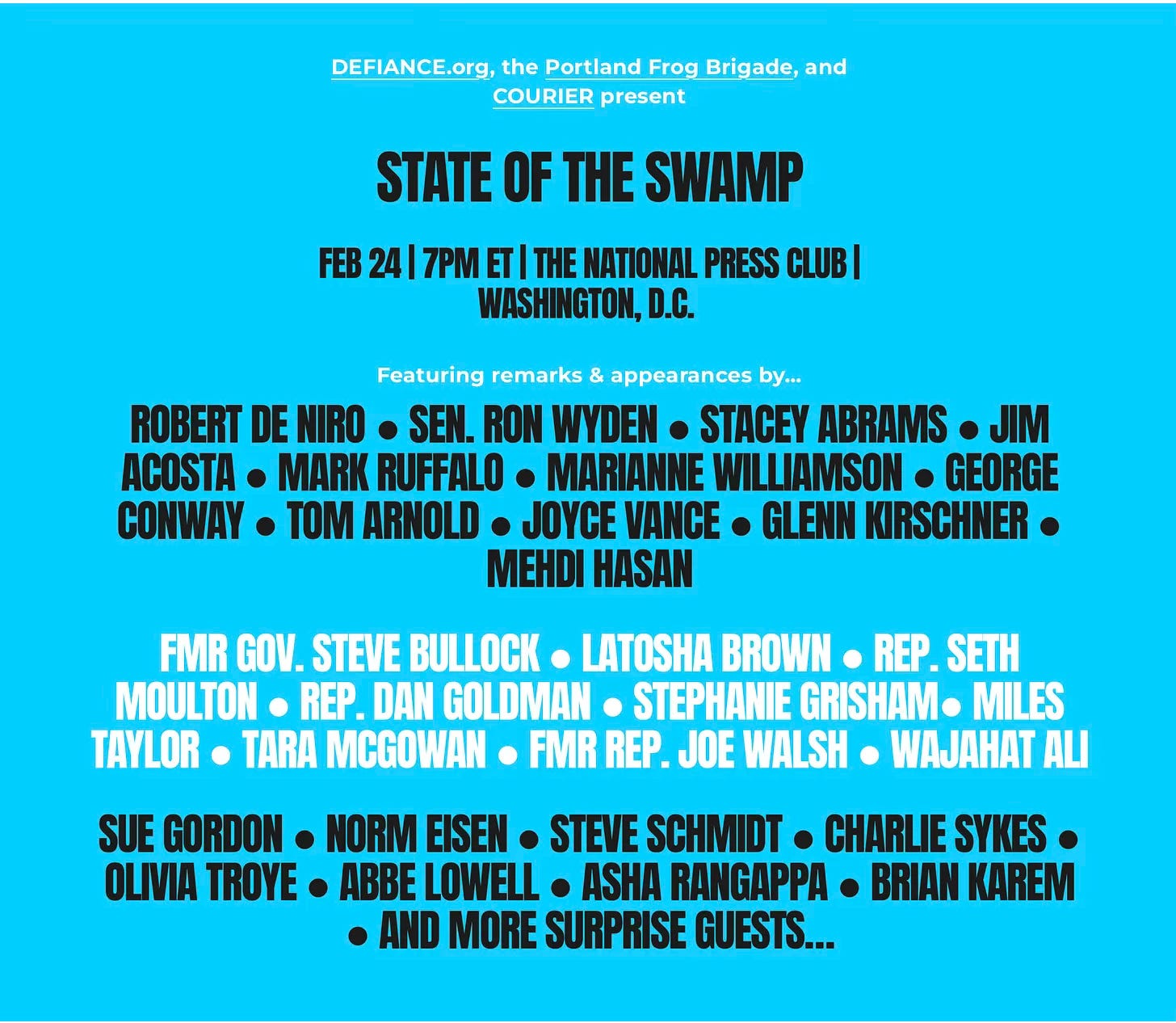 On February 24, while Donald Trump delivers his address inside the U.S. Capitol, Defiance.org and partner organizations will convene a public counter-gathering at the National Press Club in Washington, D.C. — State of the Swamp.